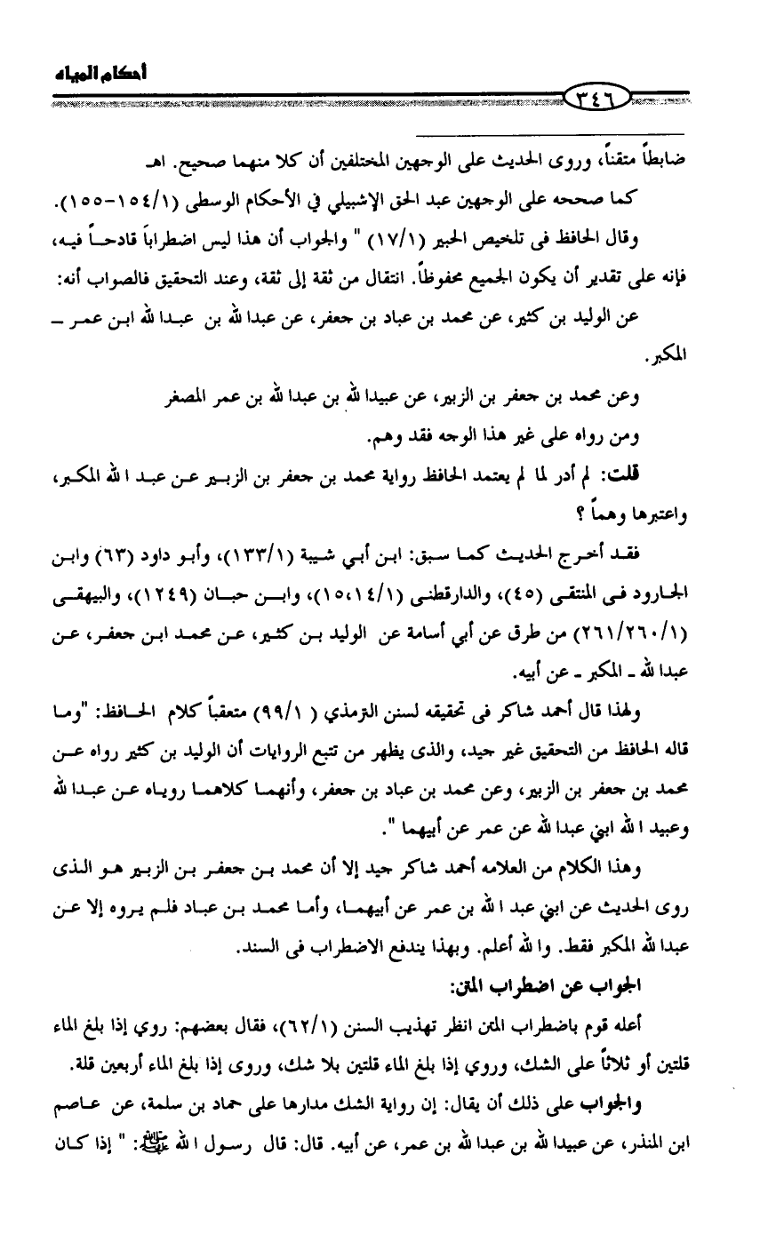 ولهذا قال أحمد شاكر فى تحقيقه لسنن الترمذي (1/ 99) متعقباً كلام الحافظ: "وما قاله الحافظ من التحقيق غير جيد، والذى يظهر من تتبع الروايات أن الوليد بن كثير رواه عن محمد بن جعفر بن الزبير، وعن محمد بن عباد بن جعفر، وأنهما كلاهما روياه عن عبد الله وعبيد الله ابني عبد الله عن عمر عن أبيهما ".