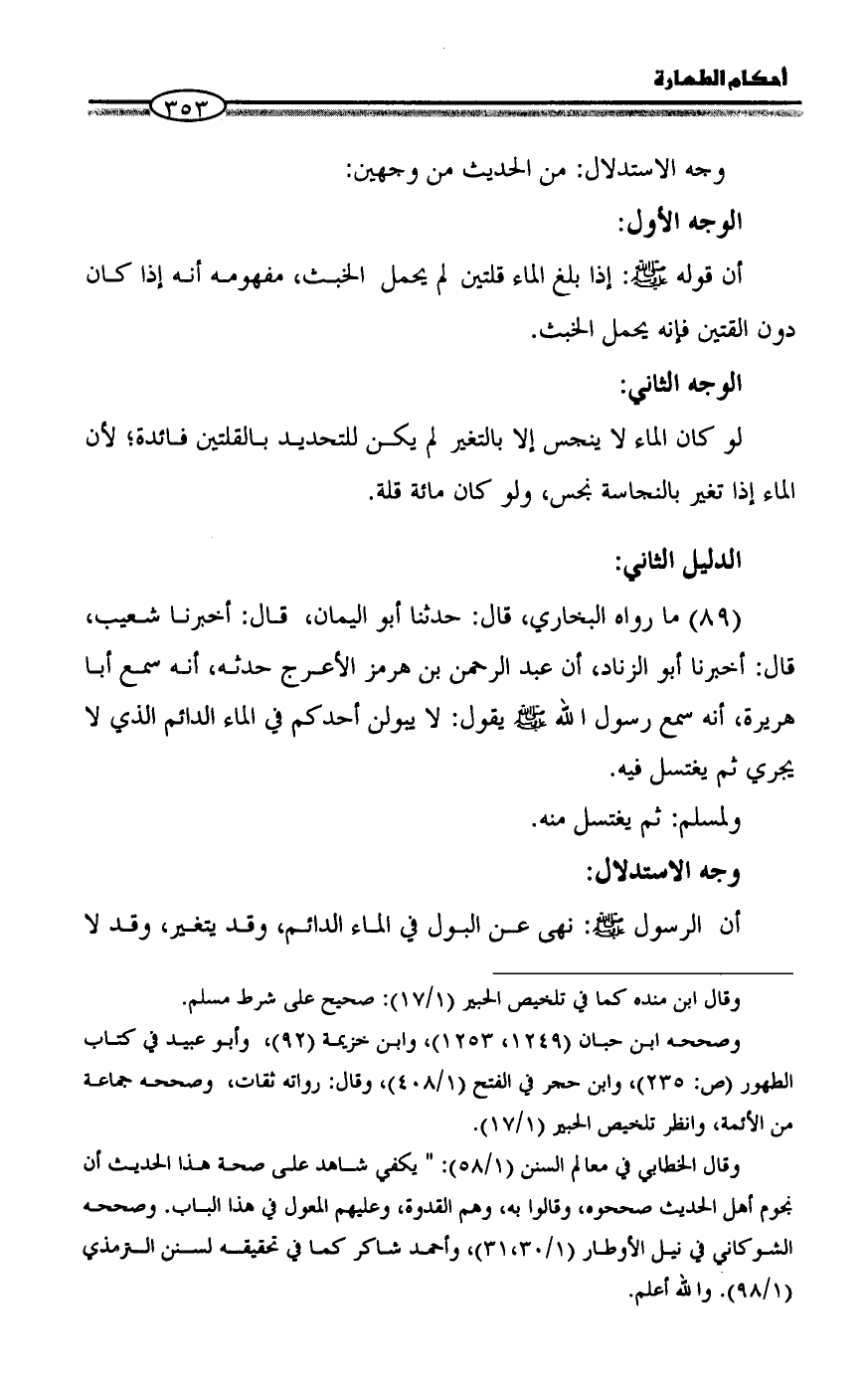 (89) ما رواه البخاري، قال: حدثنا أبو اليمان، قال: أخبرنا شعيب، قال: أخبرنا أبو الزناد، أن عبد الرحمن بن هرمز الأعرج حدثه، أنه سمع أبا هريرة، أنه سمع رسول الله - صلى الله عليه وسلم - يقول: لا يبولن أحدكم في الماء الدائم الذي لا يجري ثم يغتسل فيه.