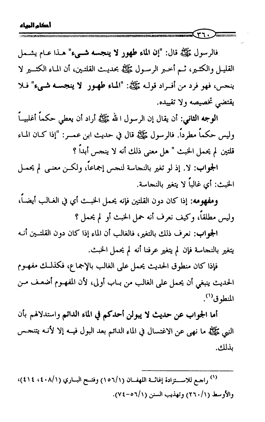 فالرسول - صلى الله عليه وسلم - قال: "إن الماء طهور لا ينجسه شىء" هذا عام يشمل القليل والكثير، ثم أخبر الرسول - صلى الله عليه وسلم - بحديث القلتين، أن الماء الكثير لا ينجس، فهو فرد من أفراد قوله - صلى الله عليه وسلم -: "الماء طهور لا ينجسه شىء" فلا يقتضي تخصيصه ولا تقييده.