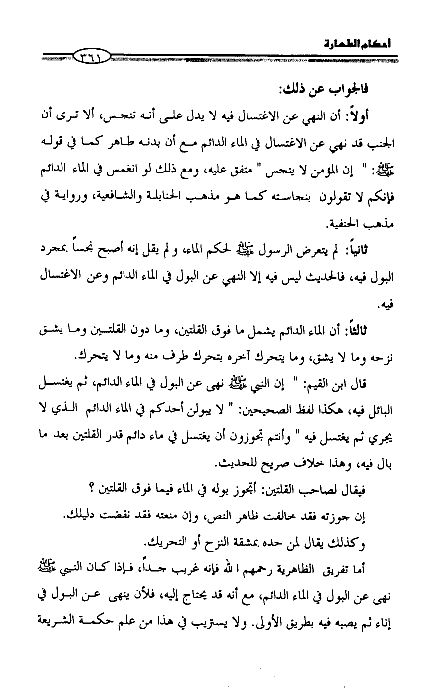 قال ابن القيم: " إن النبي - صلى الله عليه وسلم - نهى عن البول في الماء الدائم، ثم يغتسل البائل فيه، هكذا لفظ الصحيحين: " لا يبولن أحدكم في الماء الدائم الذي لا يجري ثم يغتسل فيه " وأنتم تجوزون أن يغتسل في ماء دائم قدر القلتين بعد ما بال فيه، وهذا خلاف صريح للحديث.