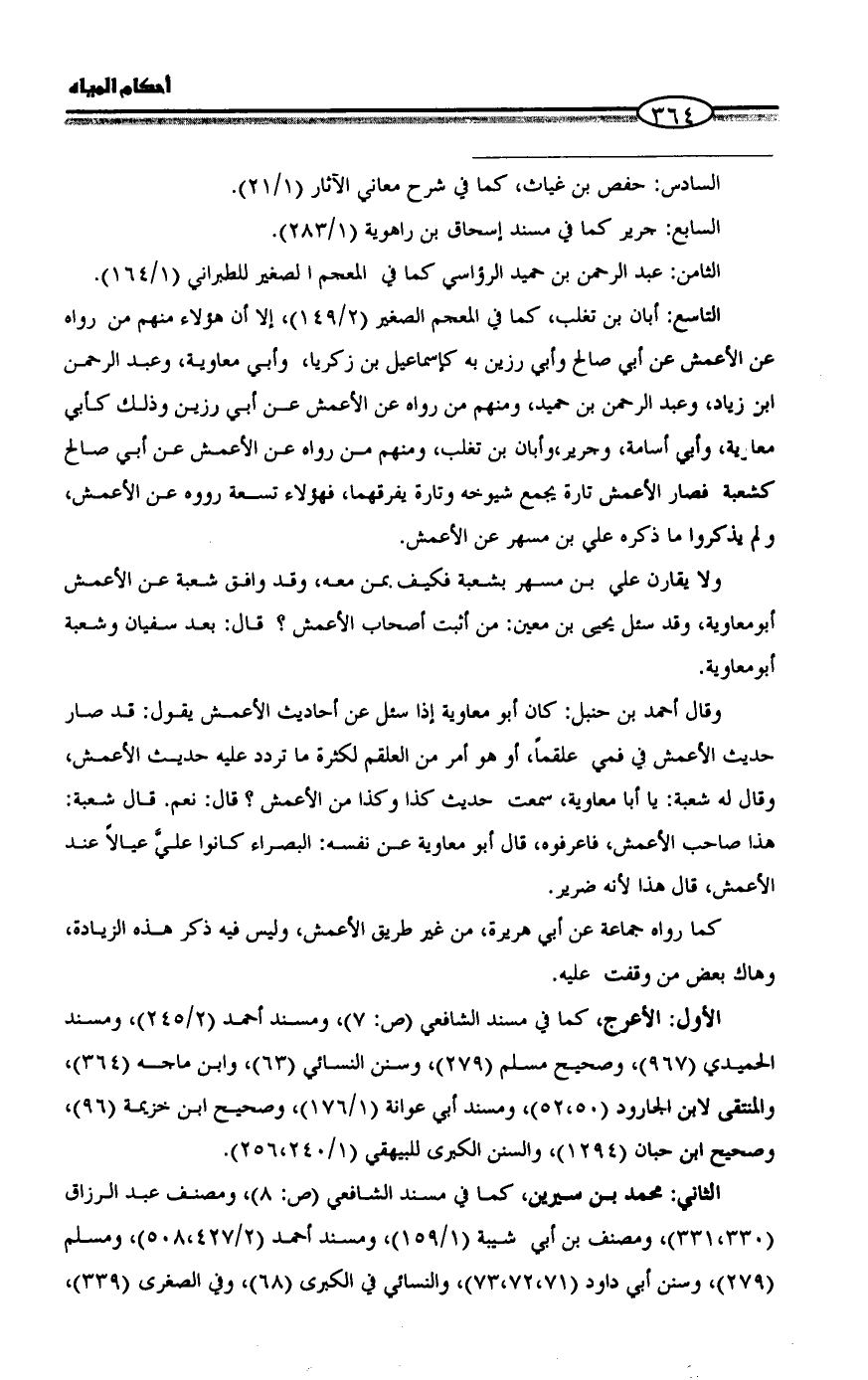التاسع: أبان بن تغلب، كما في المعجم الصغير (2/ 149)، إلا أن هؤلاء منهم من رواه عن الأعمش عن أبي صالح وأبي رزين به كإسماعيل بن زكريا، وأبي معاوية، وعبد الرحمن بن زياد، وعبد الرحمن بن حميد، ومنهم من رواه عن الأعمش عن أبي رزين وذلك كأبي معاوية، وأبي أسامة، وجرير، وأبان بن تغلب، ومنهم من رواه عن الأعمش عن أبي صالح كشعبة فصار الأعمش تارة يجمع شيوخه وتارة يفرقهما، فهؤلاء تسعة رووه عن الأعمش، ولم يذكروا ما ذكره علي بن مسهر عن الأعمش.