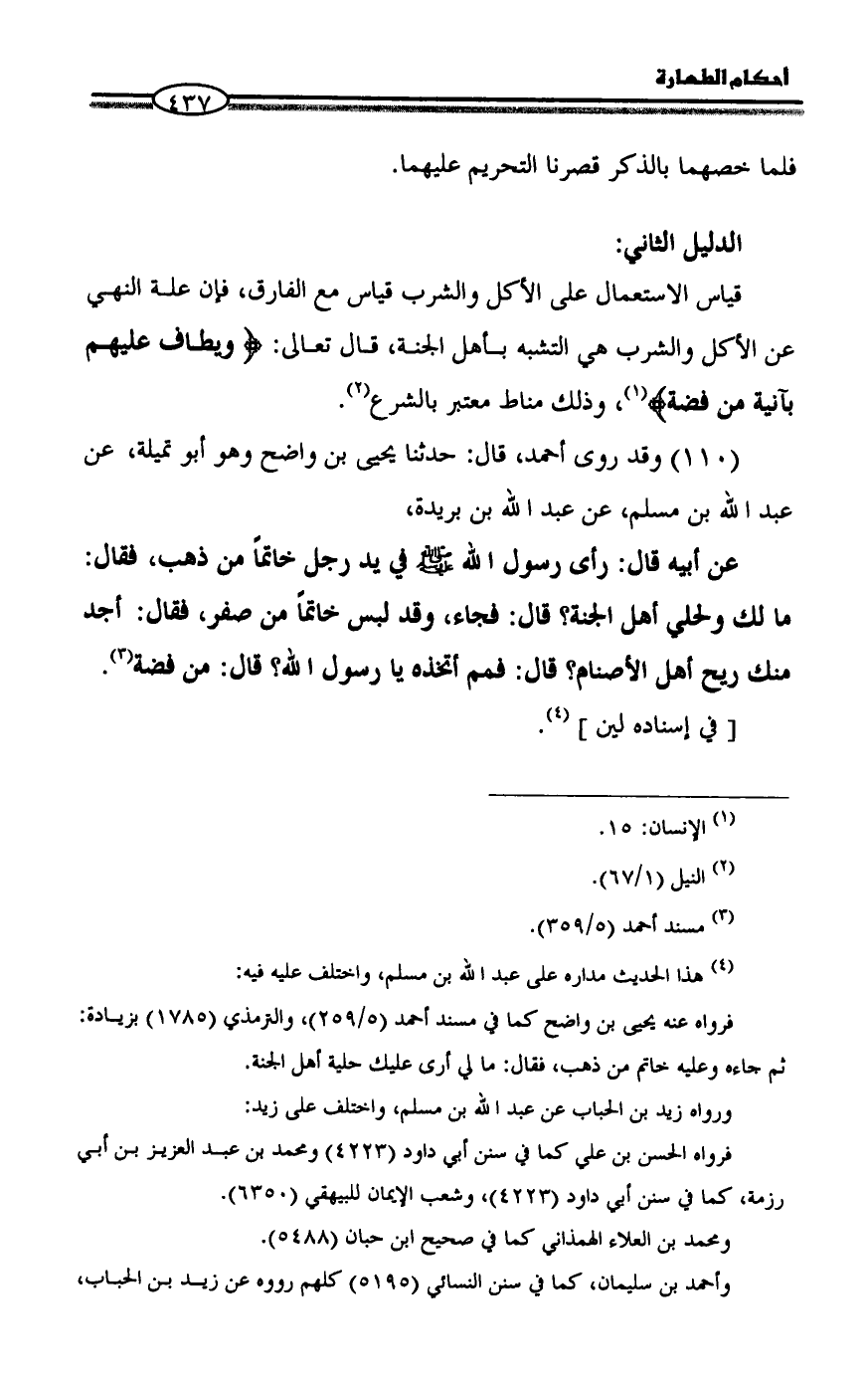 قياس الاستعمال على الأكل والشرب قياس مع الفارق، فإن علة النهي عن الأكل والشرب هي التشبه بأهل الجنة، قال تعالى: {ويطاف عليهم بآنية من فضة} (¬1)، وذلك مناط معتبر بالشرع (¬2).
