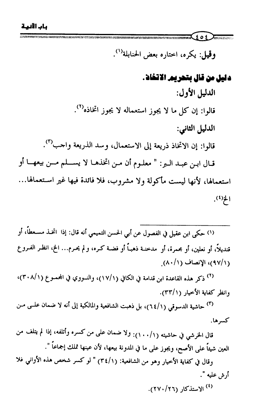 (¬1) حكى ابن عقيل في الفصول عن أبي الحسن التميمي أنه قال: إذا اتخذ مسعطاً، أو قنديلاً، أو نعلين، أو مجمرة، أو مدخنة ذهباً أو فضة كره، ولم يحرم ... الخ، انظر الفروع (1/ 97)، الإنصاف (1/ 80).