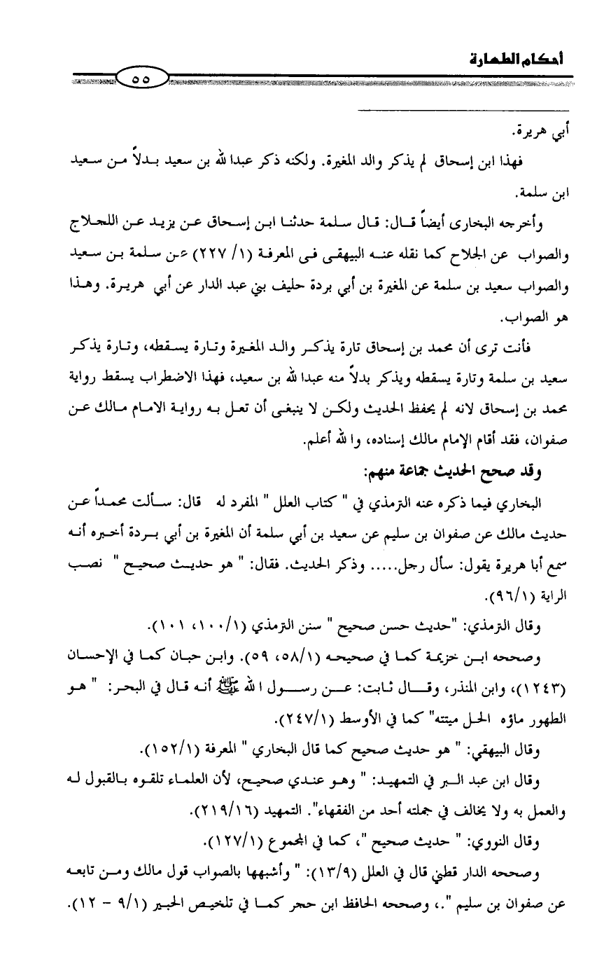 فأنت ترى أن محمد بن إسحاق تارة يذكر والد المغيرة وتارة يسقطه، وتارة يذكر سعيد بن سلمة وتارة يسقطه ويذكر بدلاً منه عبد الله بن سعيد، فهذا الاضطراب يسقط رواية محمد بن إسحاق لانه لم يحفظ الحديث ولكن لا ينبغى أن تعل به رواية الامام مالك عن صفوان، فقد أقام الإمام مالك إسناده، والله أعلم.
