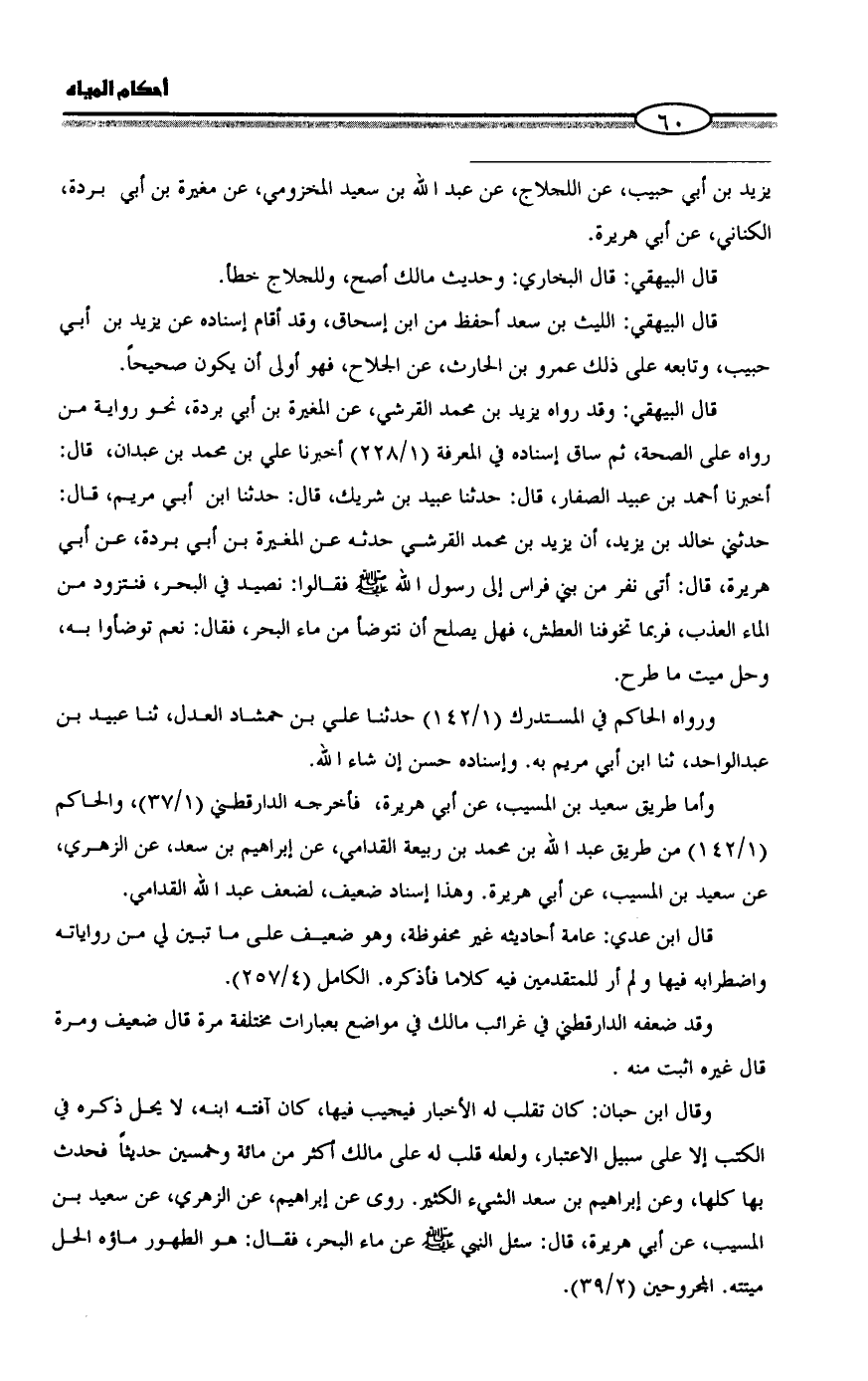وقال ابن حبان: كان تقلب له الأخبار فيجيب فيها، كان آفته ابنه، لا يحل ذكره في الكتب إلا على سبيل الاعتبار، ولعله قلب له على مالك أكثر من مائة وخمسين حديثاً فحدث بها كلها، وعن إبراهيم بن سعد الشيء الكثير. روى عن إبراهيم، عن الزهري، عن سعيد بن المسيب، عن أبي هريرة، قال: سئل النبي - صلى الله عليه وسلم - عن ماء البحر، فقال: هو الطهور ماؤه الحل ميتته. المجروحين (2/ 39). =