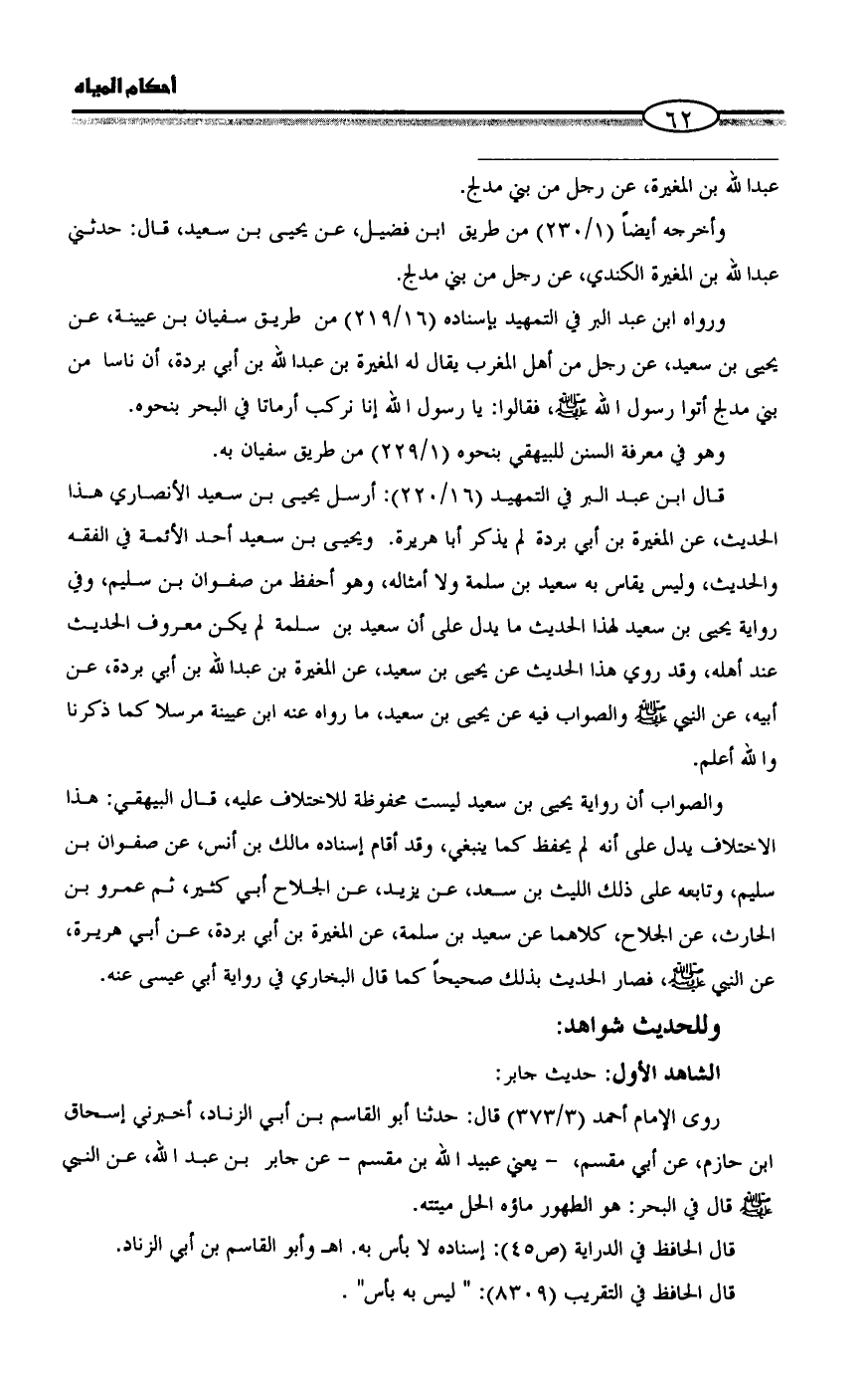 ورواه ابن عبد البر في التمهيد بإسناده (16/ 219) من طريق سفيان بن عيينة، عن يحيى بن سعيد، عن رجل من أهل المغرب يقال له المغيرة بن عبد الله بن أبي بردة، أن ناسا من بني مدلج أتوا رسول الله - صلى الله عليه وسلم -، فقالوا: يا رسول الله إنا نركب أرماتا في البحر بنحوه.