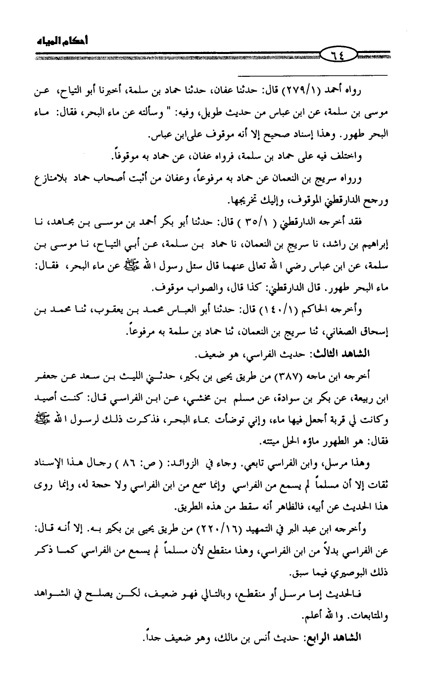 ورواه سريج بن النعمان عن حماد به مرفوعاً، وعفان من أثبت أصحاب حماد بلامنازع ورجح الدارقطني الموقوف، وإليك تخريجها.