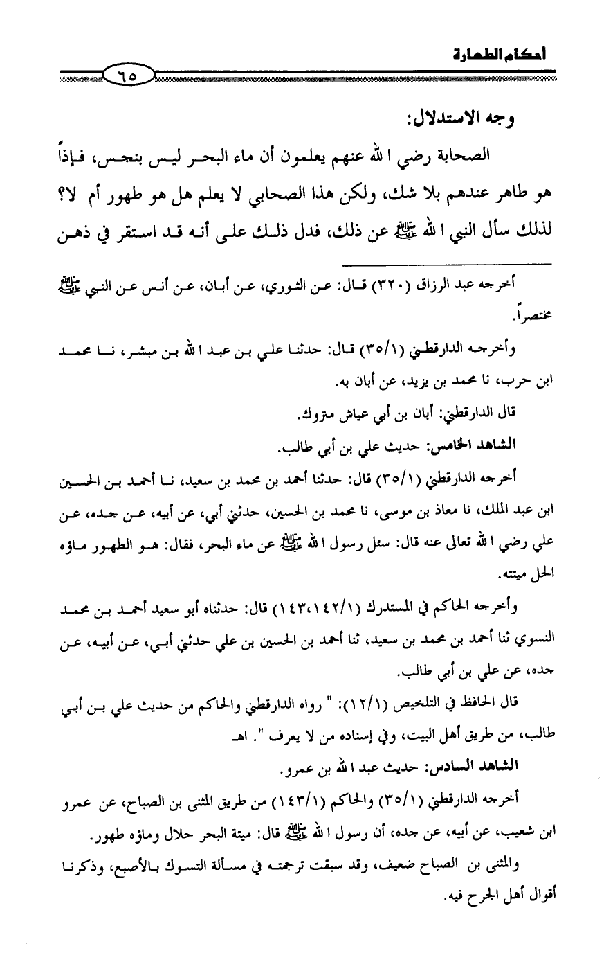 أخرجه الدارقطني (1/ 35) قال: حدثنا أحمد بن محمد بن سعيد، نا أحمد بن الحسين بن عبد الملك، نا معاذ بن موسى، نا محمد بن الحسين، حدثني أبي، عن أبيه، عن جده، عن علي رضي الله تعالى عنه قال: سئل رسول الله - صلى الله عليه وسلم - عن ماء البحر، فقال: هو الطهور ماؤه الحل ميتته.