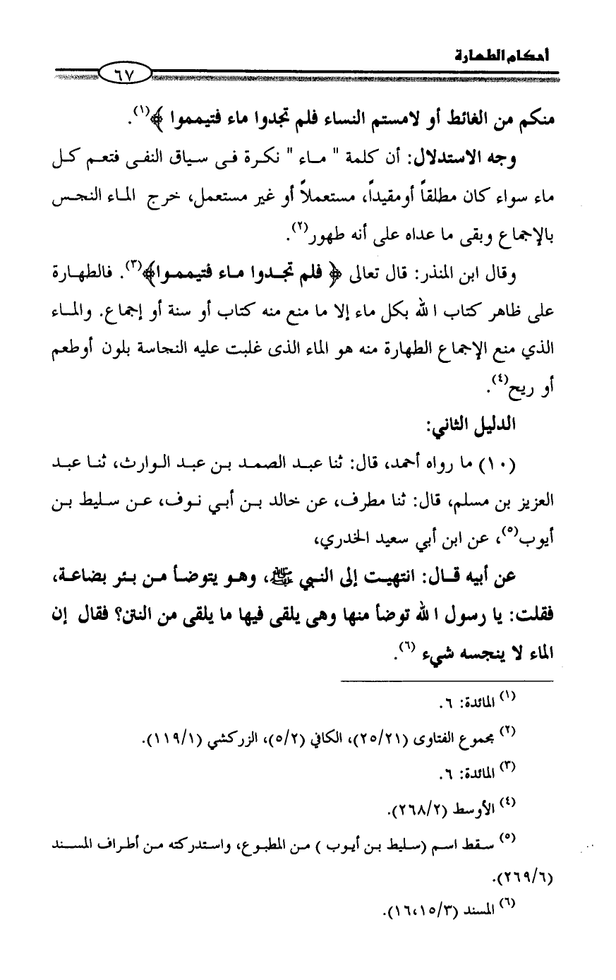 وقال ابن المنذر: قال تعالى {فلم تجدوا ماء فتيمموا} (¬3). فالطهارة على ظاهر كتاب الله بكل ماء إلا ما منع منه كتاب أو سنة أو إجماع. والماء الذي منع الإجماع الطهارة منه هو الماء الذى غلبت عليه النجاسة بلون أوطعم أو ريح (¬4).