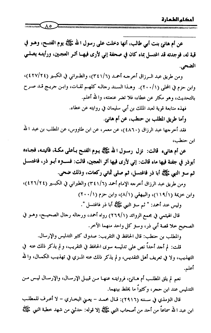 عن أم هانىء قالت: نزل رسول الله - صلى الله عليه وسلم - يوم الفتح بأعلى مكة، فأتيته، فجاءه أبوذر في جفنة فيها ماء قالت: إني لأرى فيها أثر العجين، قالت: فستره أبو ذر، فاغتسل ثم ستر النبي - صلى الله عليه وسلم - أبا ذر فاغتسل، ثم صلى ثماني ركعات، وذلك ضحى.