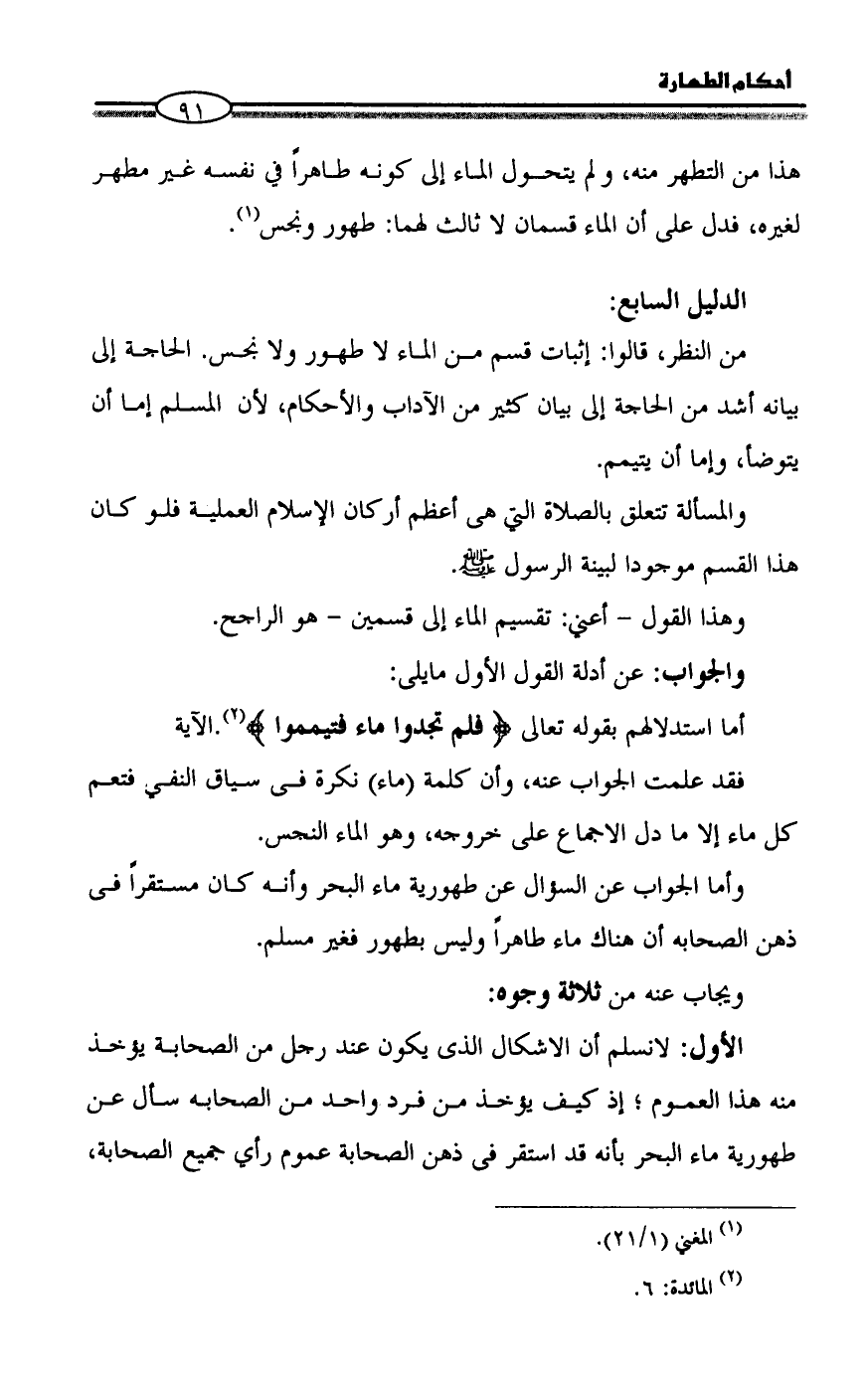 فقد علمت الجواب عنه، وأن كلمة (ماء) نكرة فى سياق النفي فتعم كل ماء إلا ما دل الاجماع على خروجه، وهو الماء النجس.