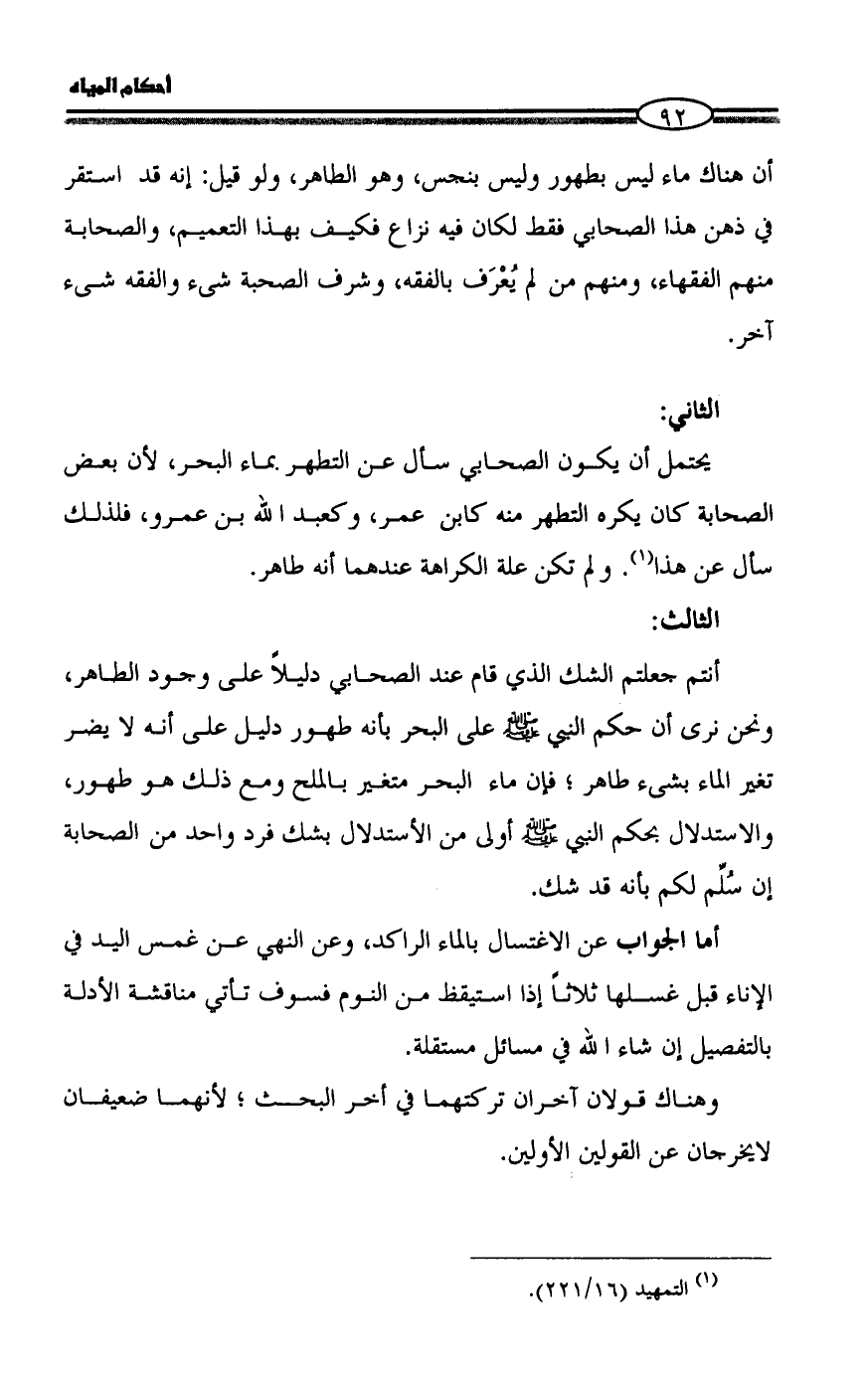 أن هناك ماء ليس بطهور وليس بنجس، وهو الطاهر، ولو قيل: إنه قد استقر في ذهن هذا الصحابي فقط لكان فيه نزاع فكيف بهذا التعميم، والصحابة منهم الفقهاء، ومنهم من لم يُعْرَف بالفقه، وشرف الصحبة شىء والفقه شىء آخر.
