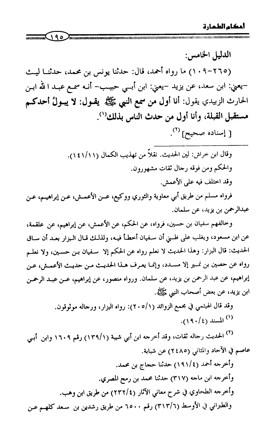 (265 - 109) ما رواه أحمد، قال: حدثنا يونس بن محمد، حدثنا ليث -يعني: ابن سعد، عن يزيد -يعني: ابن أبي حبيب- أنه سمع عبد الله بن الحارث الزبيدي يقول: أنا أول من سمع النبي - صلى الله عليه وسلم - يقول: لا يبولُ أحدكم مستقبل القبلة، وأنا أول من حدث الناس بذلك (¬1).