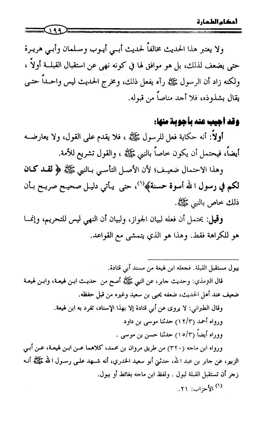 ولا يعتبر هذا الحديث مخالفاً لحديث أبي أيوب وسلمان وأبي هريرة حتى يضعف لذلك، بل هو موافق لها في كونه نهى عن استقبال القبلة أولاً، ولكنه زاد أن الرسول - صلى الله عليه وسلم - رآه يفعل ذلك، ومخرج الحديث ليس واحداً حتى يقال بشذوذه، فلا أجد مناصاً من قبوله.
