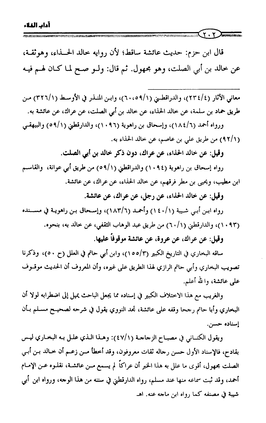 ويقول الكناني في مصباح الزجاجة (1/ 47): وهذا الذي علل به البخاري ليس بقادح، فالإسناد الأول حسن رجاله ثقات معروفون، وقد أخطأ من زعم أن خالد بن أبي الصلت مجهول، أقوى ما علل به هذا الخبر أن عراكاً لم يسمع من عائشة، نقلوه عن الإمام أحمد، وقد ثبت سماعه منها عند مسلم، رواه الدارقطني في سننه من هذا الوجه، ورواه ابن أبي شيبة في مصنفه كما رواه ابن ماجه عنه. اهـ