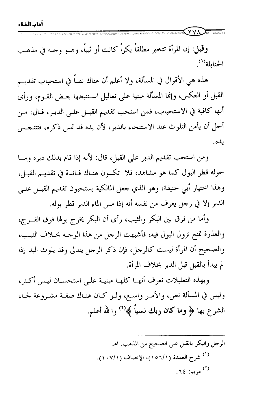 وأما من فرق بين البكر والثيب، رأى أن البكر يخرج بولها فوق الفرج، والعذرة تمنع نزول البول فيه، فأشبهت الرجل من هذا الوجه بخلاف الثيب، والصحيح أن المرأة ليست كالرجل، فإن ذكر الرجل يتدلى وقد يلوث اليد إذا لم يبدأ بالقبل قبل الدبر بخلاف المرأة.