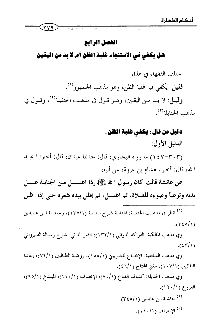 الفصل الرابع هل يكفي في الاستنجاء غلبة الظن أم لا بد من اليقين