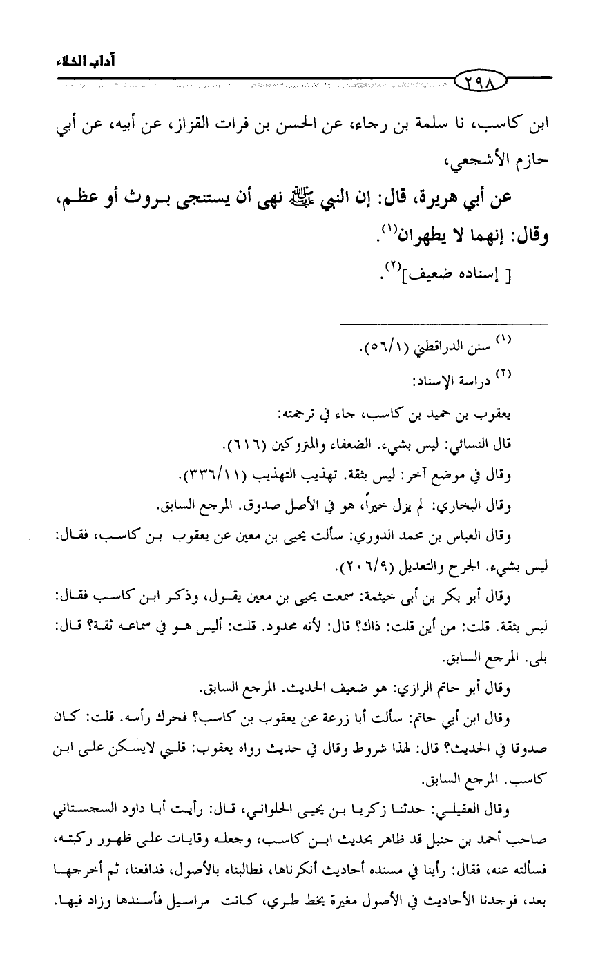 وقال العقيلي: حدثنا زكريا بن يحيى الحلواني، قال: رأيت أبا داود السجستاني صاحب أحمد بن حنبل قد ظاهر بحديث ابن كاسب، وجعله وقايات على ظهور ركبته، فسألته عنه، فقال: رأينا في مسنده أحاديث أنكرناها، فطالبناه بالأصول، فدافعنا، ثم أخرجها بعد، فوجدنا الأحاديث في الأصول مغيرة بخط طري، كانت مراسيل فأسندها وزاد فيها. =