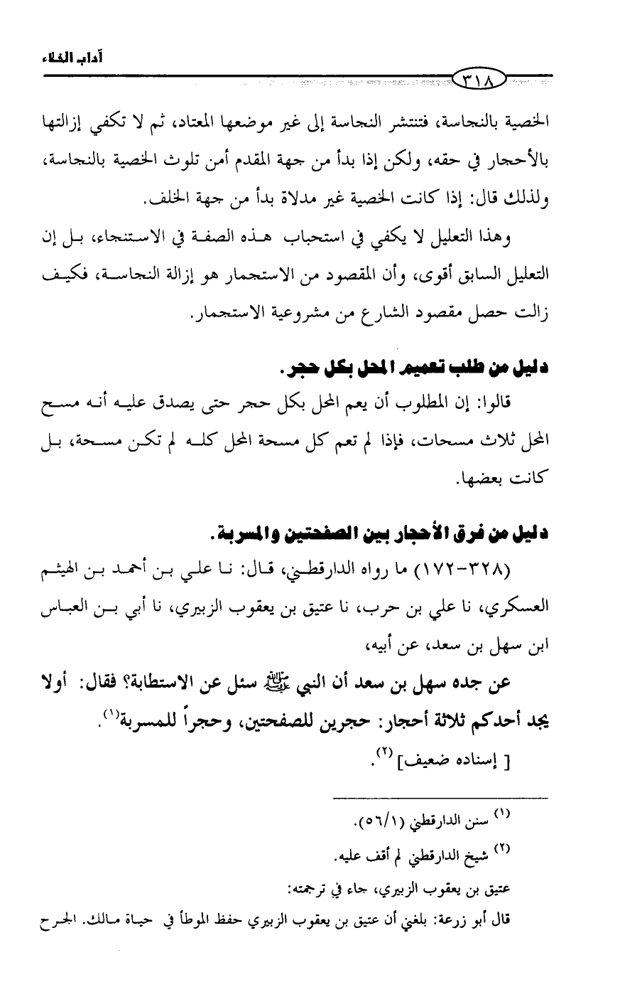 (328 - 172) ما رواه الدارقطني، قال: نا علي بن أحمد بن الهيثم العسكري، نا علي بن حرب، نا عتيق بن يعقوب الزبيري، نا أبي بن العباس بن سهل بن سعد، عن أبيه،