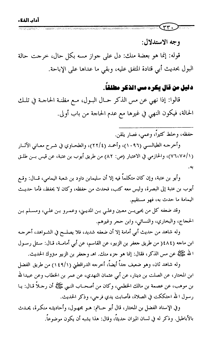 قالوا: إذا نهي عن مس الذكر حال البول، مع مظنة الحاجة في تلك الحالة، فيكون النهي في غيرها مع عدم الحاجة من باب أولى.