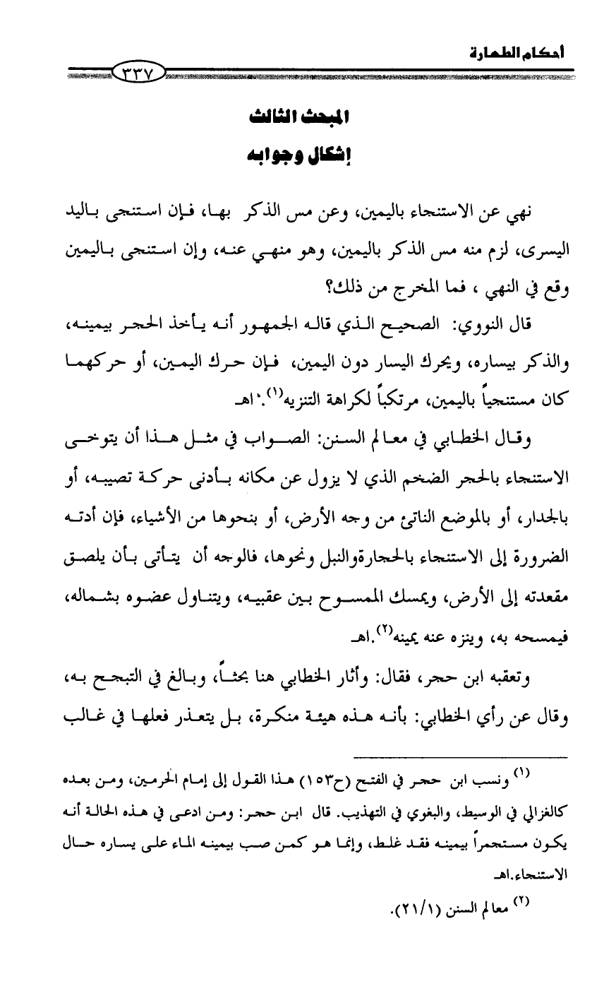 (¬1) ونسب ابن حجر في الفتح (ح153) هذا القول إلى إمام الحرمين، ومن بعده كالغزالي في الوسيط، والبغوي في التهذيب. قال ابن حجر: ومن ادعى في هذه الحالة أنه يكون مستجمراً بيمينه فقد غلط، وإنما هو كمن صب بيمينه الماء على يساره حال الاستنجاء. اهـ