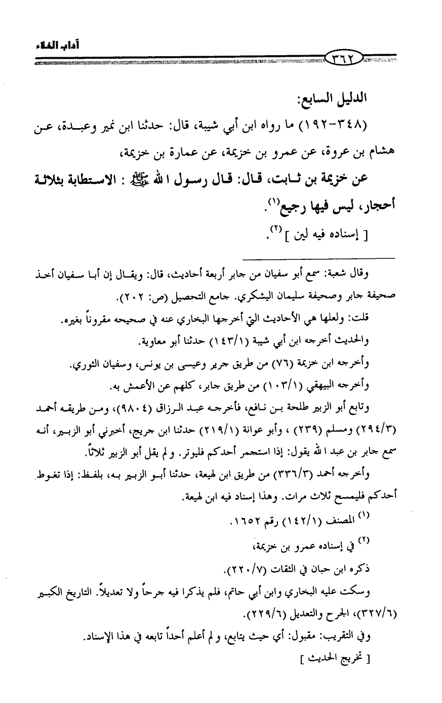 (347 - 191) ما رواه ابن أبي شيبة، قال: حدثنا ابن نمير وعبدة، عن هشام بن عروة، عن عمرو بن خزيمة، عن عمارة بن خزيمة،