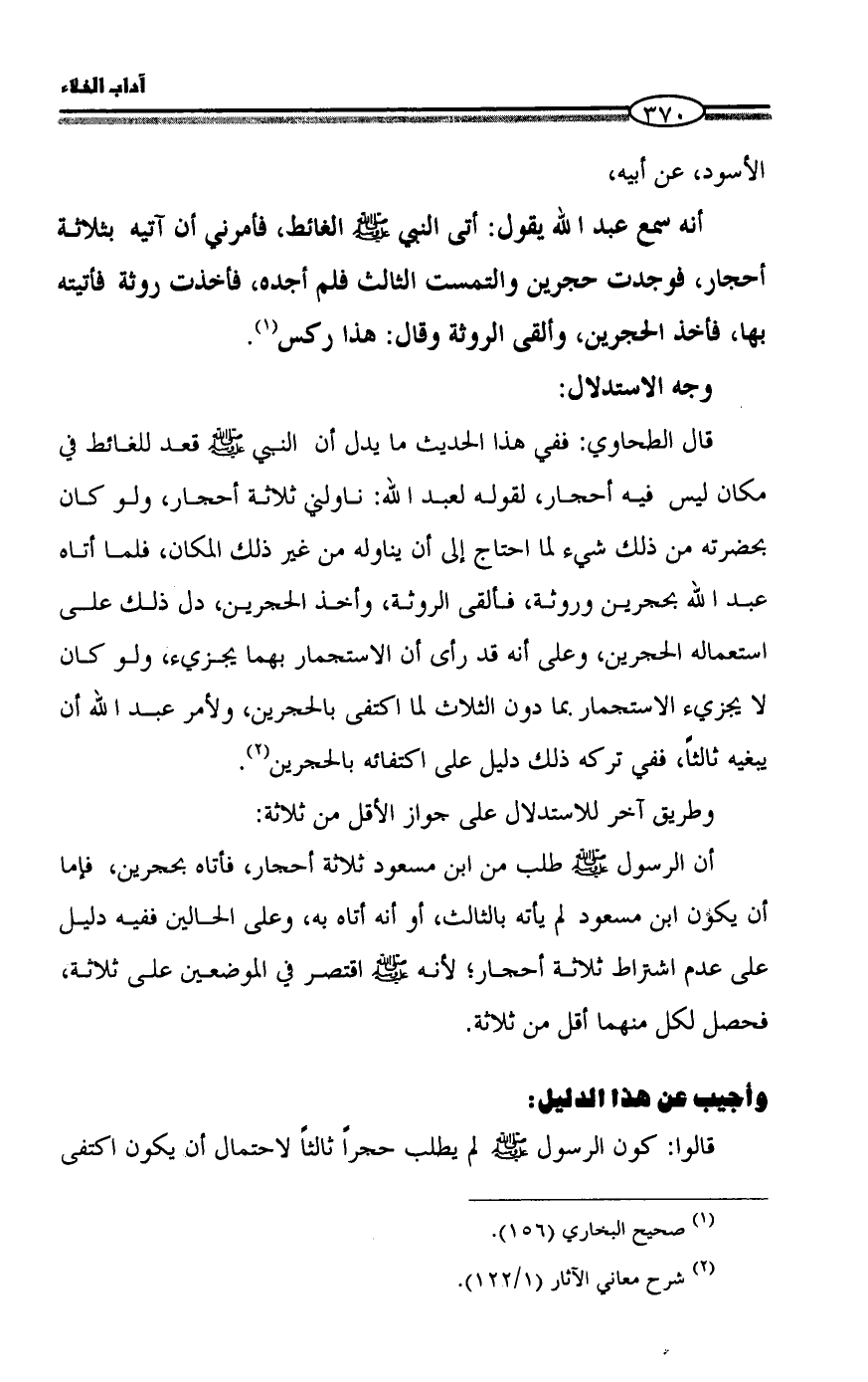 قال الطحاوي: ففي هذا الحديث ما يدل أن النبي - صلى الله عليه وسلم - قعد للغائط في مكان ليس فيه أحجار، لقوله لعبد الله: ناولني ثلاثة أحجار، ولو كان بحضرته من ذلك شيء لما احتاج إلى أن يناوله من غير ذلك المكان، فلما أتاه عبد الله بحجرين وروثة، فألقى الروثة، وأخذ الحجرين، دل ذلك على استعماله الحجرين، وعلى أنه قد رأى أن الاستجمار بهما يجزيء، ولو كان لا يجزيء الاستجمار بما دون الثلاث لما اكتفى بالحجرين، ولأمر عبد الله أن يبغيه ثالثاً، ففي تركه ذلك دليل على اكتفائه بالحجرين (¬2).