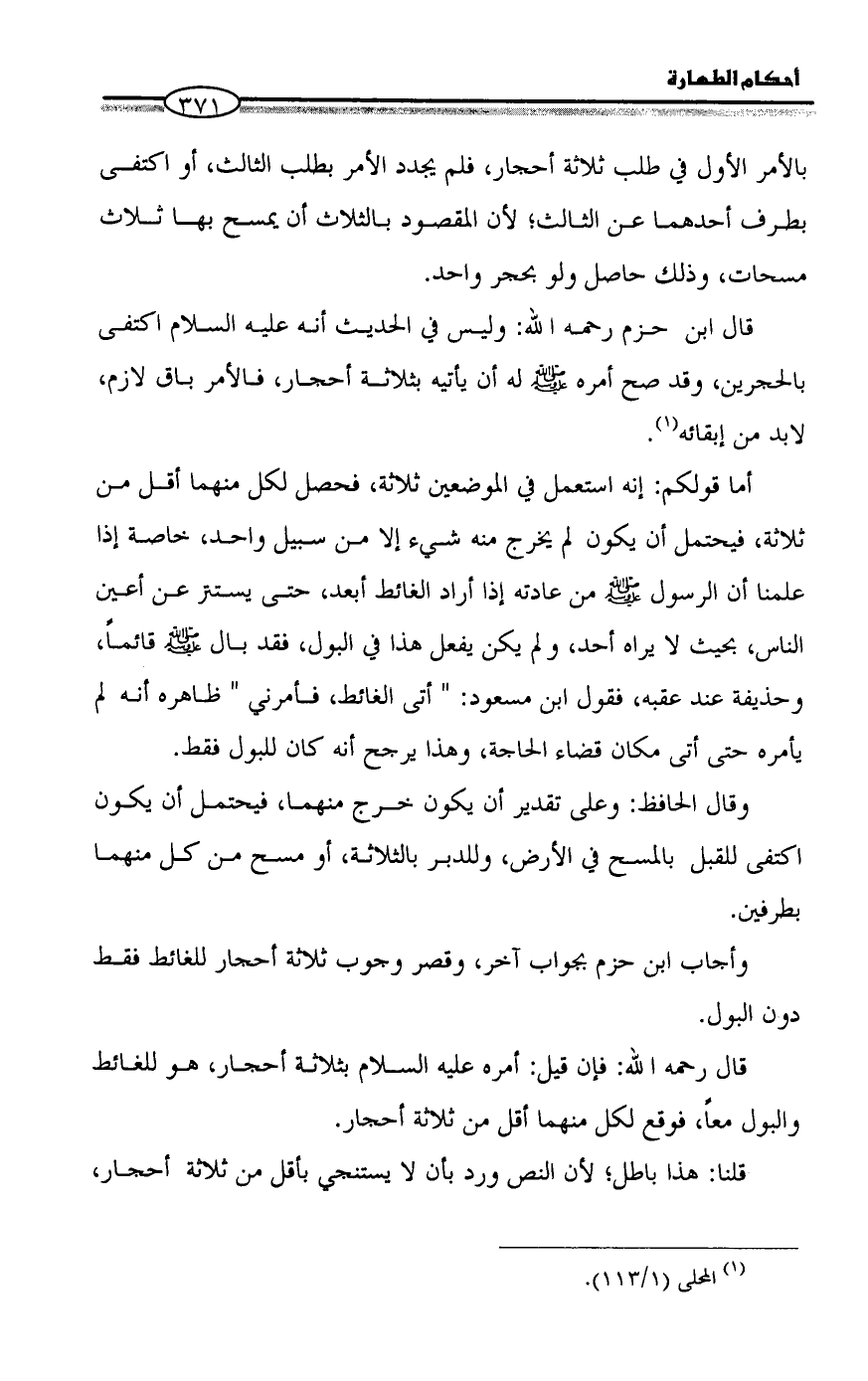 وأجاب ابن حزم بجواب آخر، وقصر وجوب ثلاثة أحجار للغائط فقط دون البول.