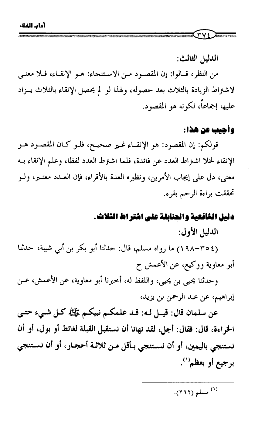 قولكم: إن المقصود: هو الإنقاء غير صحيح، فلو كان المقصود هو الإنقاء لخلا اشتراط العدد عن فائدة، فلما اشترط العدد لفظا، وعلم الإنقاء به معنى، دل على إيجاب الأمرين، ونظيره العدة بالأقراء، فإن العدد معتبر، ولو تحققت براءة الرحم بقرء.