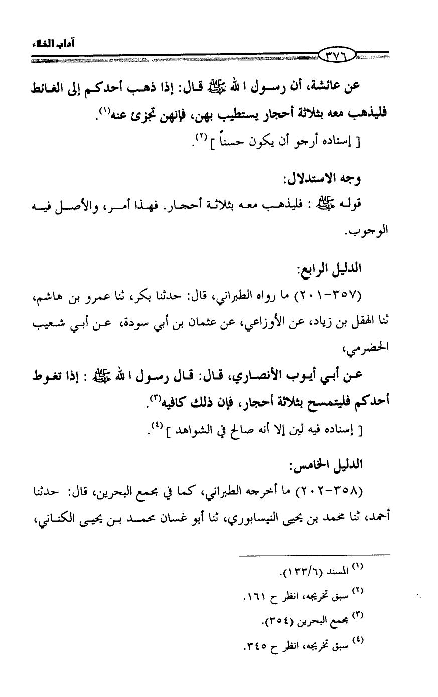 عن عائشة، أن رسول الله صلى الله عليه وسلم قال: إذا ذهب أحدكم إلى الغائط فليذهب معه بثلاثة أحجار يستطيب بهن، فإنهن تجزئ عنه (¬1).