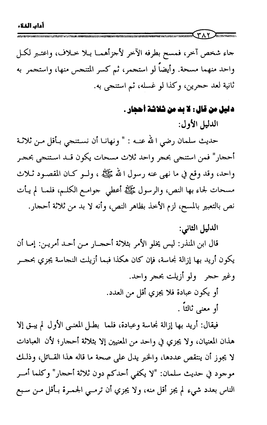 حديث سلمان رضي الله عنه: " ونهانا أن نستنجي بأقل من ثلاثة أحجار" فمن استنجى بحجر واحد ثلاث مسحات يكون قد استنجى بحجر واحد، وقد وقع في ما نهى عنه رسول الله - صلى الله عليه وسلم -، ولو كان المقصود ثلاث مسحات لجاء بها النص، والرسول - صلى الله عليه وسلم - أعطي جوامع الكلم، فلما لم يأت نص بالتعبير بالمسح، لزم الأخذ بظاهر النص، وأنه لا بد من ثلاثة أحجار.
