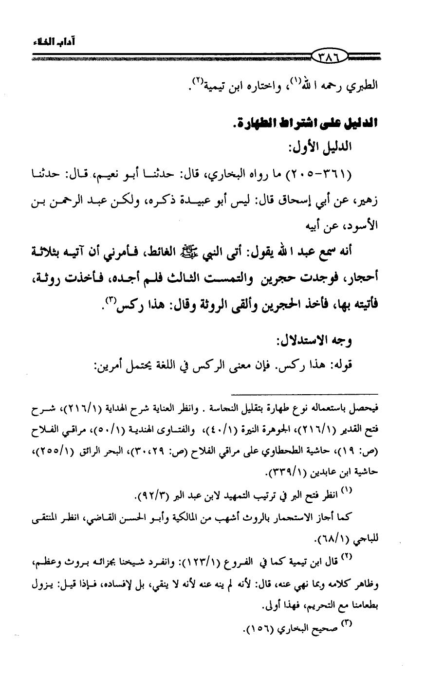 أنه سمع عبد الله يقول: أتى النبي - صلى الله عليه وسلم - الغائط، فأمرني أن آتيه بثلاثة أحجار، فوجدت حجرين والتمست الثالث فلم أجده، فأخذت روثة، فأتيته بها، فأخذ الحجرين وألقى الروثة وقال: هذا ركس (¬3).