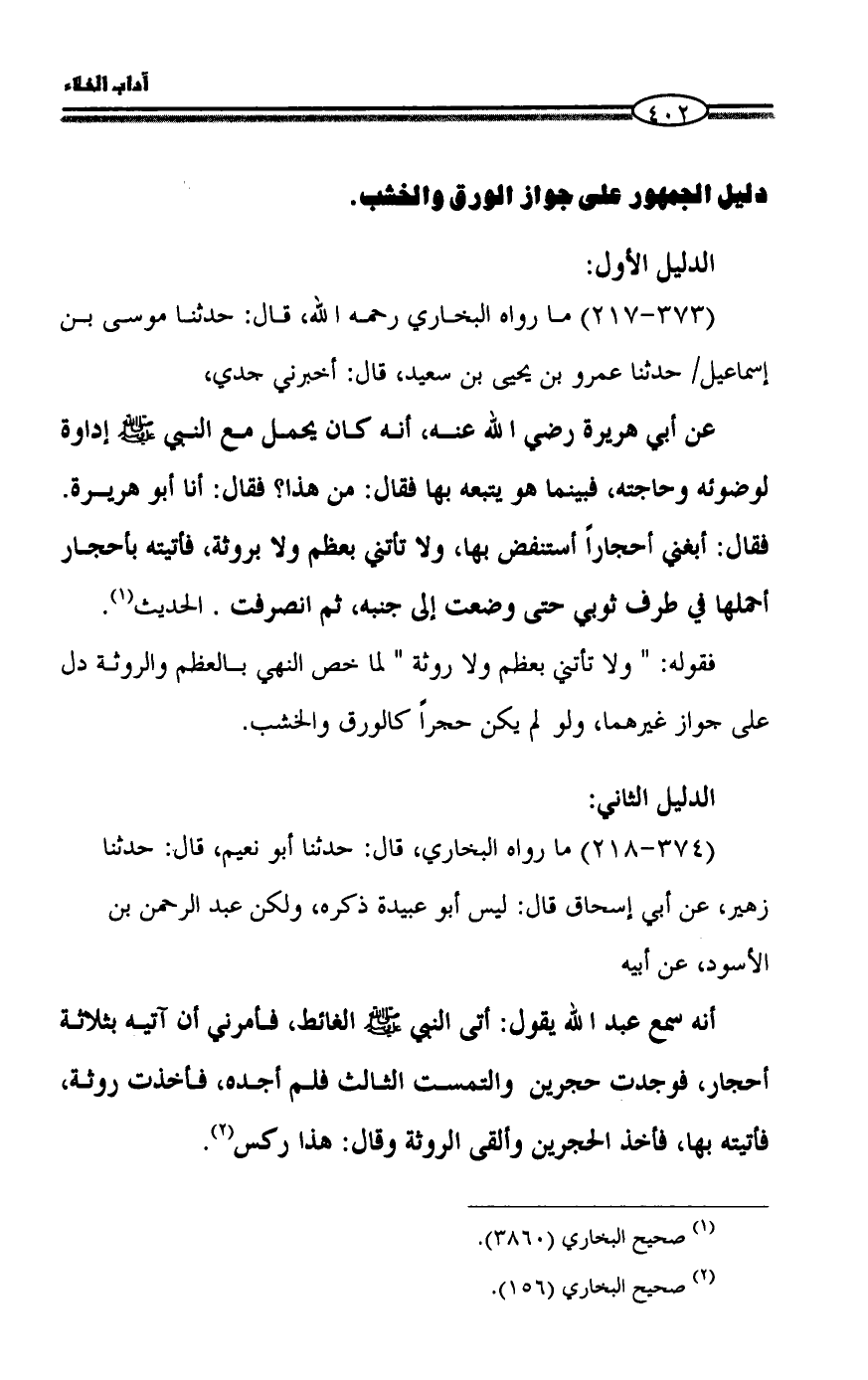 أنه سمع عبد الله يقول: أتى النبي - صلى الله عليه وسلم - الغائط، فأمرني أن آتيه بثلاثة أحجار، فوجدت حجرين والتمست الثالث فلم أجده، فأخذت روثة، فأتيته بها، فأخذ الحجرين وألقى الروثة وقال: هذا ركس (¬2).