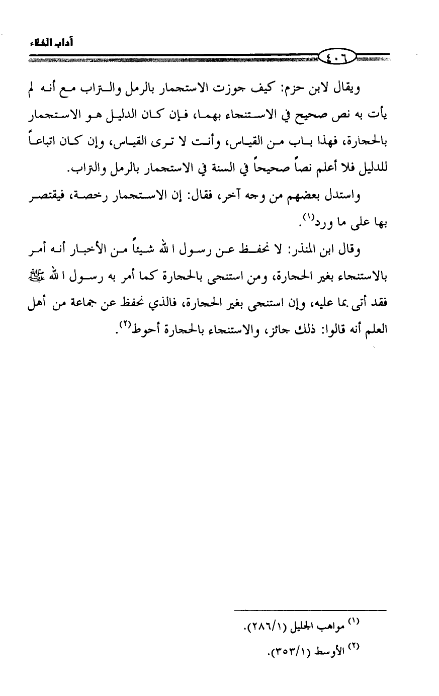 ويقال لابن حزم: كيف جوزت الاستجمار بالرمل والتراب مع أنه لم يأت به نص، فإن كان الدليل هو الاستجمار بالحجارة، فهذا باب من القياس، وأنت لا ترى القياس، وإن كان اتباعاً للدليل فلا أعلم نصاً في السنة في الاستجمار بالرمل والتراب.