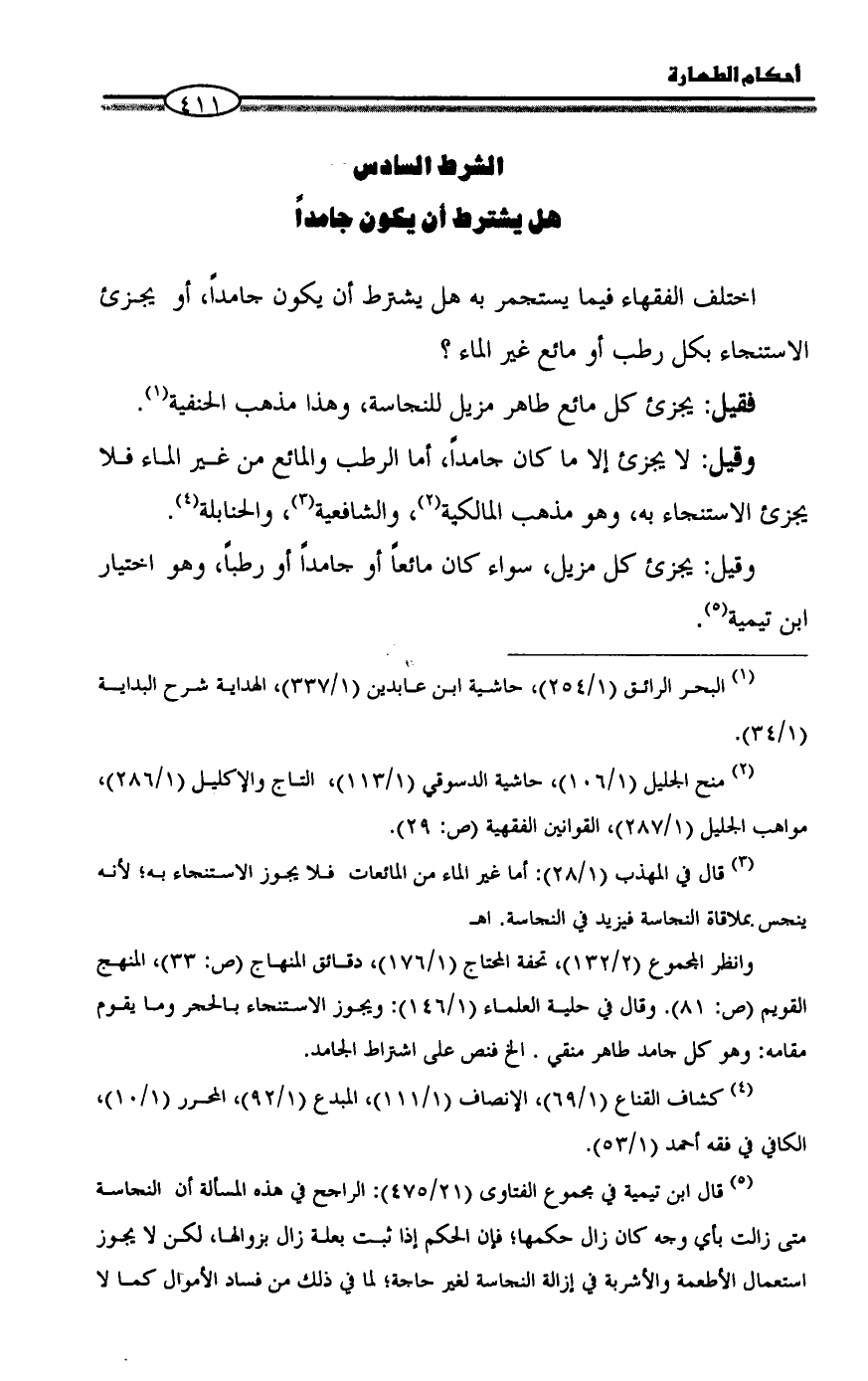 وانظر المجموع (2/ 132)، تحفة المحتاج (1/ 176)، دقائق المنهاج (ص: 33)، المنهج القويم (ص: 81). وقال في حلية العلماء (1/ 146): ويجوز الاستنجاء بالحجر وما يقوم مقامه: وهو كل جامد طاهر منقي. الخ فنص على اشتراط الجامد.