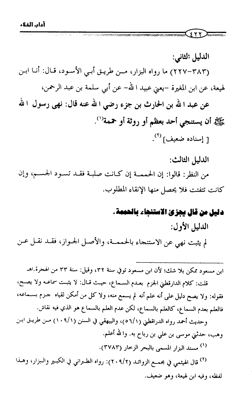 عن عبد الله بن الحارث بن جزء رضي الله عنه قال: نهى رسول الله - صلى الله عليه وسلم - أن يستنجي أحد بعظم أو روثة أو حممة (¬1).
