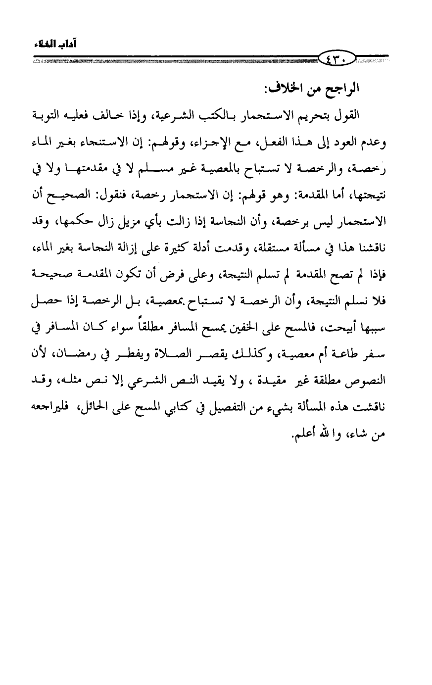 القول بتحريم الاستجمار بالكتب الشرعية، وإذا خالف فعليه التوبة وعدم العود إلى هذا الفعل، مع الإجزاء، وقولهم: إن الاستنجاء بغير الماء رخصة، والرخصة لا تستباح بالمعصية غير مسلم لا في مقدمتها ولا في نتيجتها، أما المقدمة: وهو قولهم: إن الاستجمار رخصة، فنقول: الصحيح أن الاستجمار ليس برخصة، وأن النجاسة إذا زالت بأي مزيل زال حكمها، وقد ناقشنا هذا في مسألة مستقلة، وقدمت أدلة كثيرة على إزالة النجاسة بغير الماء، فإذا لم تصح المقدمة لم تسلم النتيجة، وعلى فرض أن تكون المقدمة صحيحة فلا نسلم النتيجة، وأن الرخصة لا تستباح بمعصية، بل الرخصة إذا حصل سببها إبيحت، فالمسح على الخفين يمسح المسافر مطلقاً سواء كان المسافر في سفر طاعة أم معصية، وكذلك يقصر الصلاة ويفطر في رمضان، لأن النصوص مطلقة غير مقيدة، ولا يقيد النص الشرعي إلا نص مثله، وقد ناقشت هذه المسألة بشيء من التفصيل في كتابي المسح على الحائل، فليراجعه من شاء، والله أعلم.