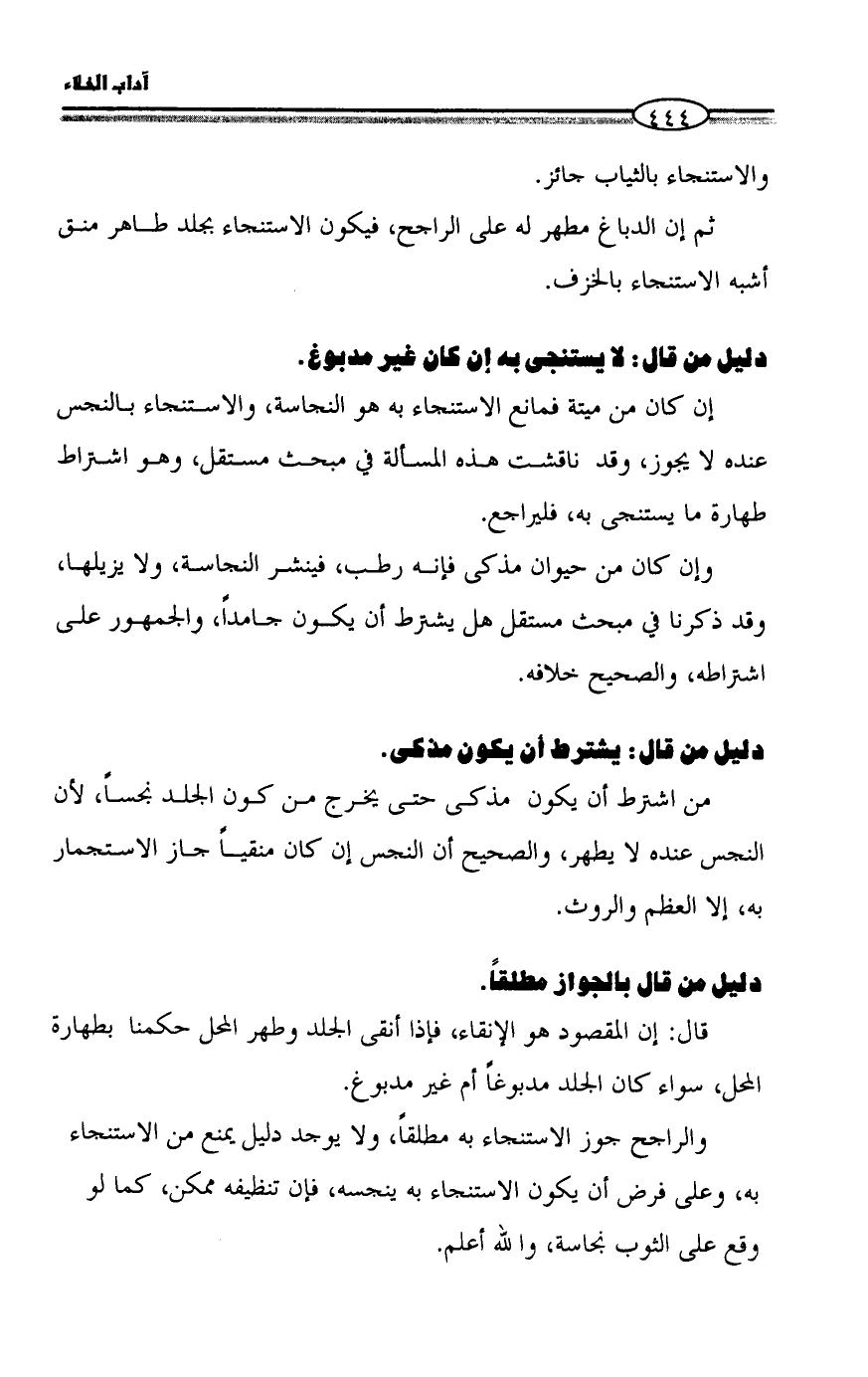 من اشترط أن يكون مذكى حتى يخرج من كون الجلد نجساً، لأن النجس عنده لا يطهر، والصحيح أن النجس إن كان منقياً جاز الاستجمار به، إلا العظم والروث.