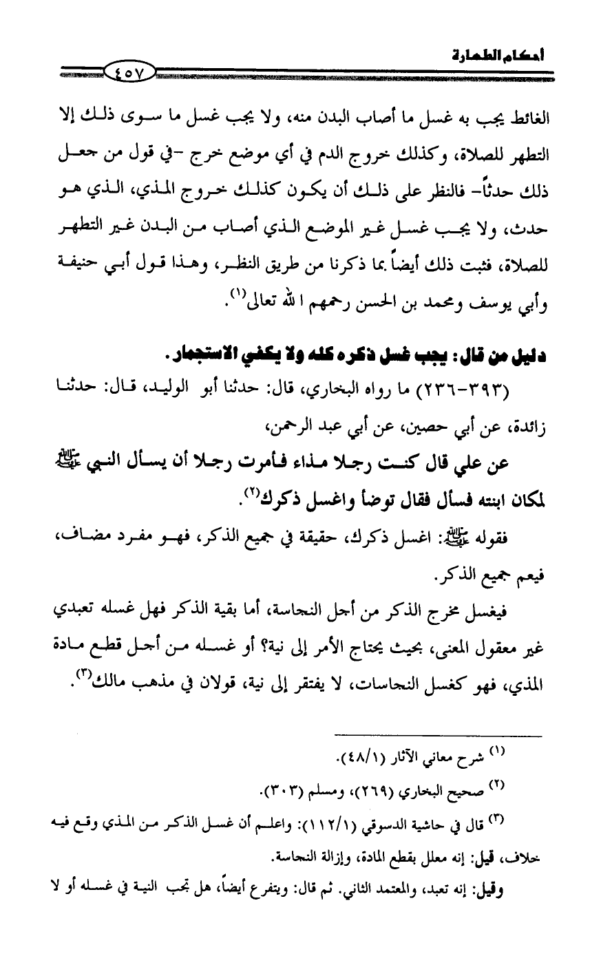 (¬3) قال في حاشية الدسوقي (1/ 112): واعلم أن غسل الذكر من المذي وقع فيه خلاف، قيل: إنه معلل بقطع المادة، وإزالة النجاسة.