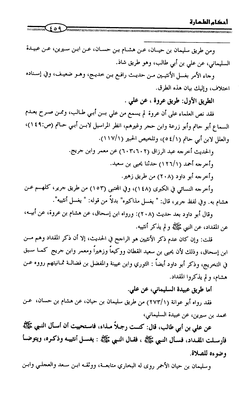 وقال أبو داود بعد حديث (208): ورواه ابن إسحاق، عن هشام بن عروة، عن أبيه، عن المقداد، عن النبي - صلى الله عليه وسلم - ولم يذكر أنثييه.