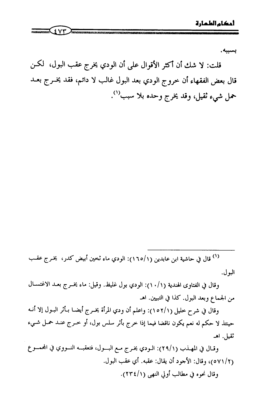 قلت: لا شك أن أكثر الأقوال على أن الودي يخرج عقب البول، لكن قال بعض الفقهاء أن خروج الودي بعد البول غالب لا دائم، فقد يخرج بعد حمل شيء ثقيل، وقد يخرج وحده بلا سبب (¬1).