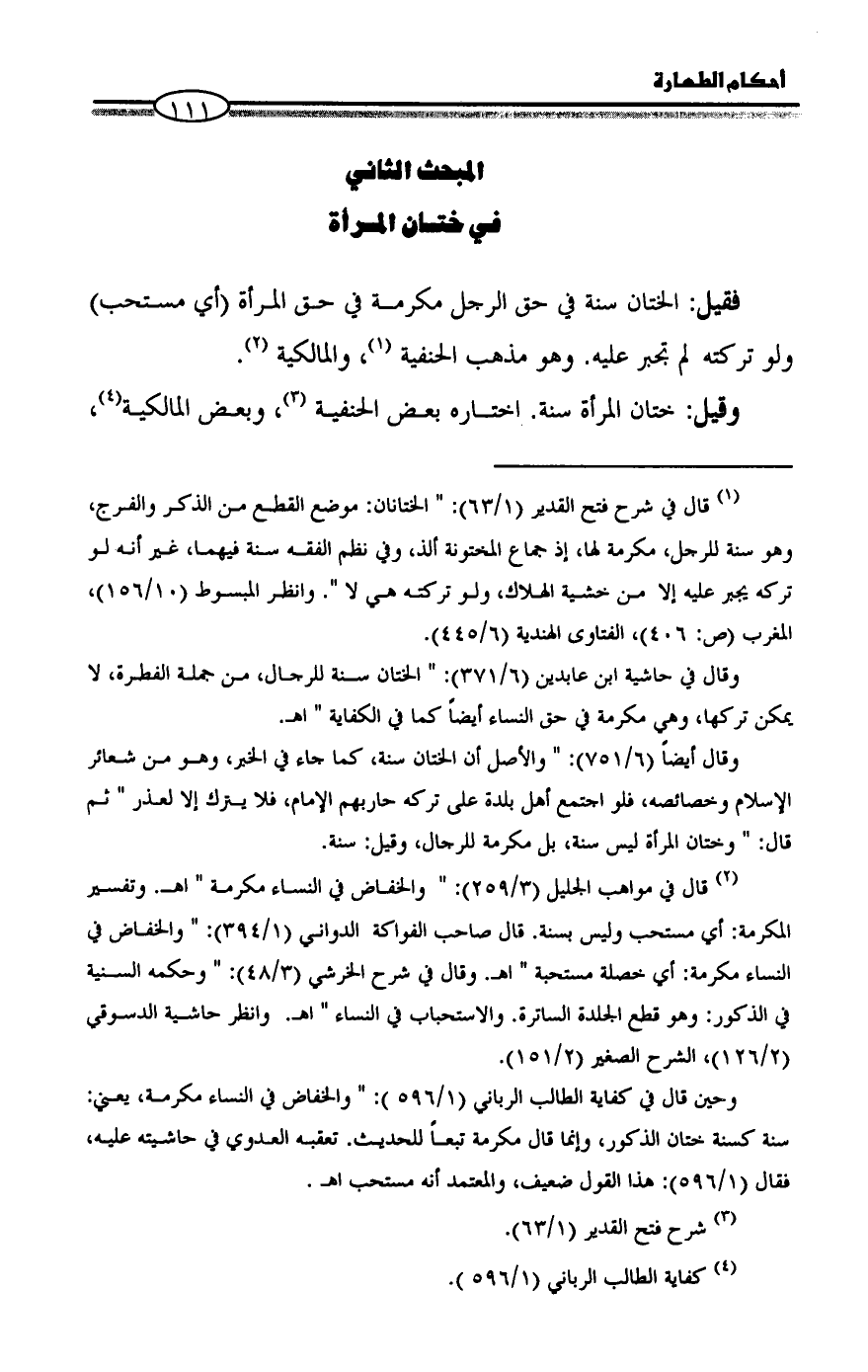 (¬1) قال في شرح فتح القدير (1/ 63): " الختانان: موضع القطع من الذكر والفرج، وهو سنة للرجل، مكرمة لها، إذ جماع المختونة ألذ، وفي نظم الفقه سنة فيهما، غير أنه لو تركه يجبر عليه إلا من خشية الهلاك، ولو تركته هي لا ". وانظر المبسوط (10/ 156)، المغرب (ص: 406)، الفتاوى الهندية (6/ 445).