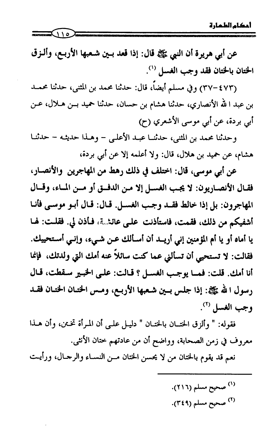 عن أبي هريرة أن النبي - صلى الله عليه وسلم - قال: إذا قعد بين شعبها الأربع، وألزق الختان بالختان فقد وجب الغسل (¬1).