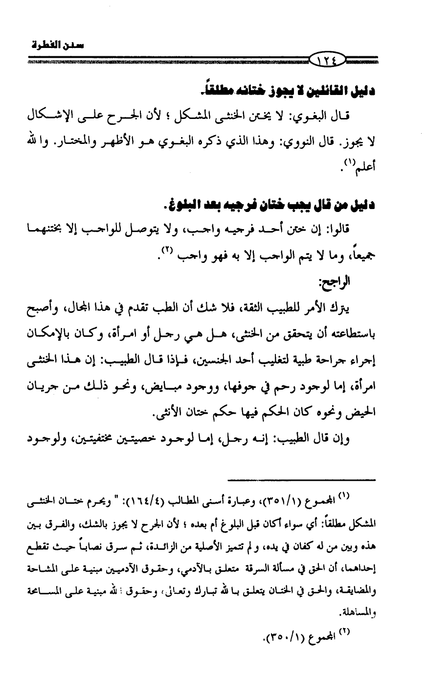 (¬1) المجموع (1/ 351)، وعبارة أسنى المطالب (4/ 164): " ويحرم ختان الخنثى المشكل مطلقاً: أي سواء أكان قبل البلوغ أم بعده؛ لأن الجرح لا يجوز بالشك، والفرق بين هذه وبين من له كفان في يده، ولم تتميز الأصلية من الزائدة، ثم سرق نصاباً حيث تقطع إحداهما، أن الحق في مسألة السرقة متعلق بالآدمي، وحقوق الآدميين مبنية على المشاحة والمضايقة، والحق في الختان يتعلق بالله تبارك وتعالى، وحقوق الله مبنية على المسامحة والمساهلة.