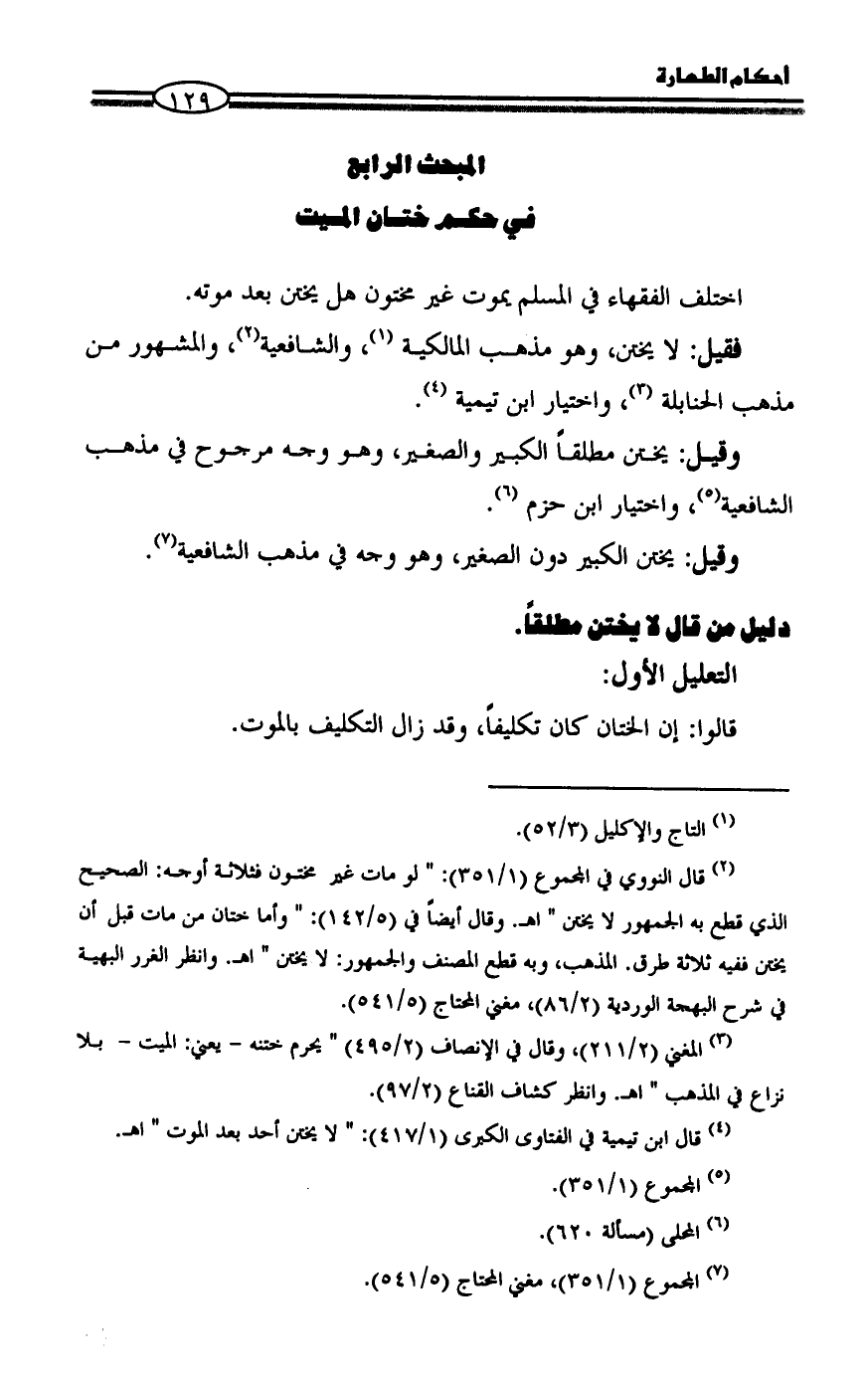 (¬4) قال ابن تيمية في الفتاوى الكبرى (1/ 417): " لا يختن أحد بعد الموت " اهـ.