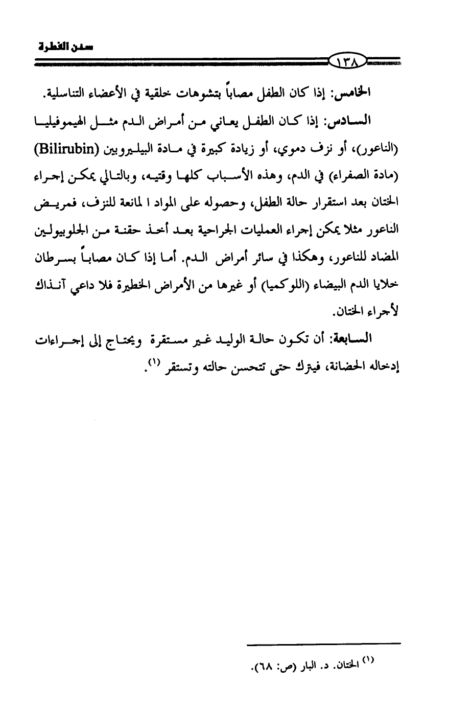 السادس: إذا كان الطفل يعاني من أمراض الدم مثل الهيموفيليا (الناعور)، أو نزف دموي، أو زيادة كبيرة في مادة البيليروبين (Bilirubin) (مادة الصفراء) في الدم، وهذه الأسباب كلها وقتيه، وبالتالي يمكن إجراء الختان بعد استقرار حالة الطفل، وحصوله على المواد المانعة للنزف، فمريض الناعور مثلا يمكن إجراء العمليات الجراحية بعد أخذ حقنة من الجلوبيولين المضاد للناعور، وهكذا في سائر أمراض الدم. أما إذا كان مصاباً بسرطان خلايا الدم البيضاء (اللوكميا) أو غيرها من الأمراض الخطيرة فلا داعي آنذاك لأجراء الختان.