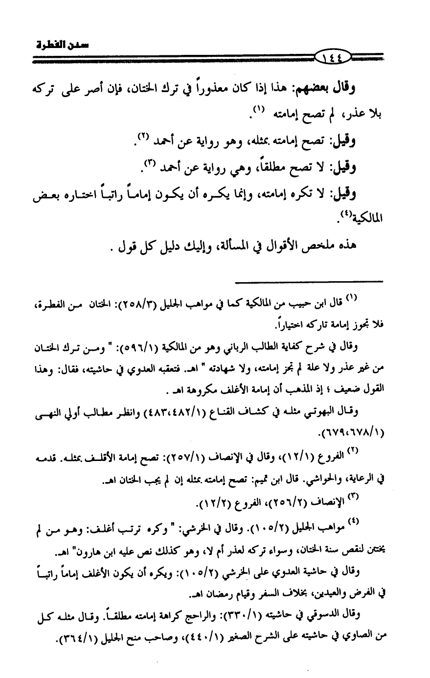 (¬1) قال ابن حبيب من المالكية كما في مواهب الجليل (3/ 258): الختان من الفطرة، فلا تجوز إمامة تاركه اختياراً.