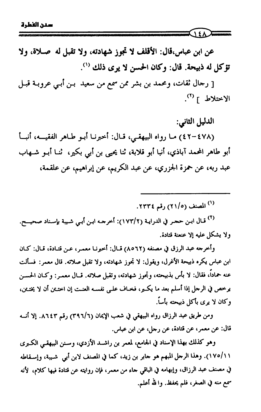 عن ابن عباس، قال: الأقلف لا تجوز شهادته، ولا تقبل له صلاة، ولا تؤكل له ذبيحة. قال: وكان الحسن لا يرى ذلك (¬1).