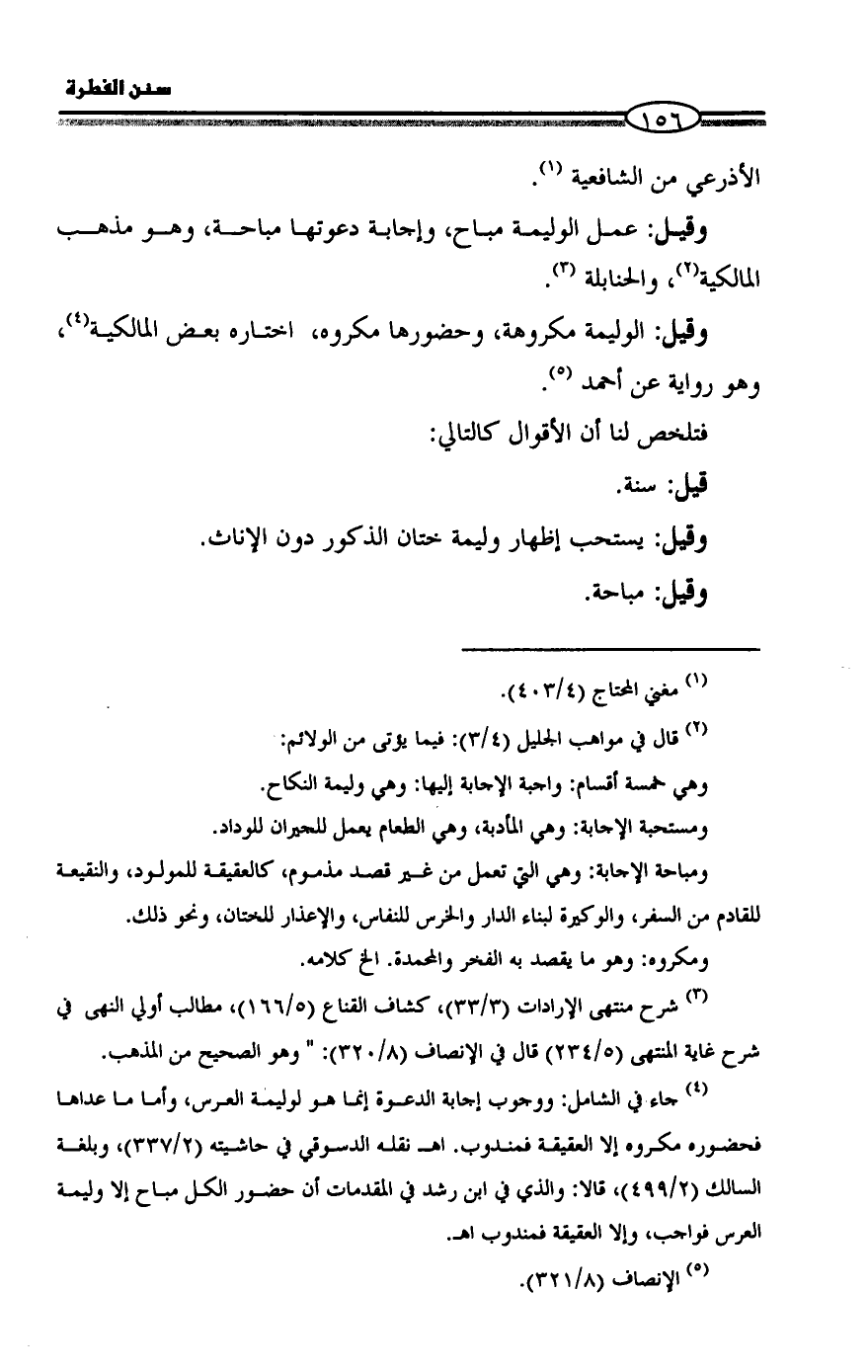 (¬4) جاء في الشامل: ووجوب إجابة الدعوة إنما هو لوليمة العرس، وأما ما عداها فحضوره مكروه إلا العقيقة فمندوب. اهـ نقله الدسوقي في حاشيته (2/ 337)، وبلغة السالك (2/ 499)، قالا: والذي في ابن رشد في المقدمات أن حضور الكل مباح إلا وليمة العرس فواجب، وإلا العقيقة فمندوب اهـ.