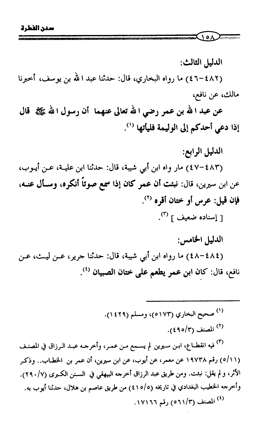 (484 - 48) ما رواه ابن أبي شيبة، قال: حدثنا جرير، عن ليث، عن نافع، قال: كان ابن عمر يطعم على ختان الصبيان (¬4).
